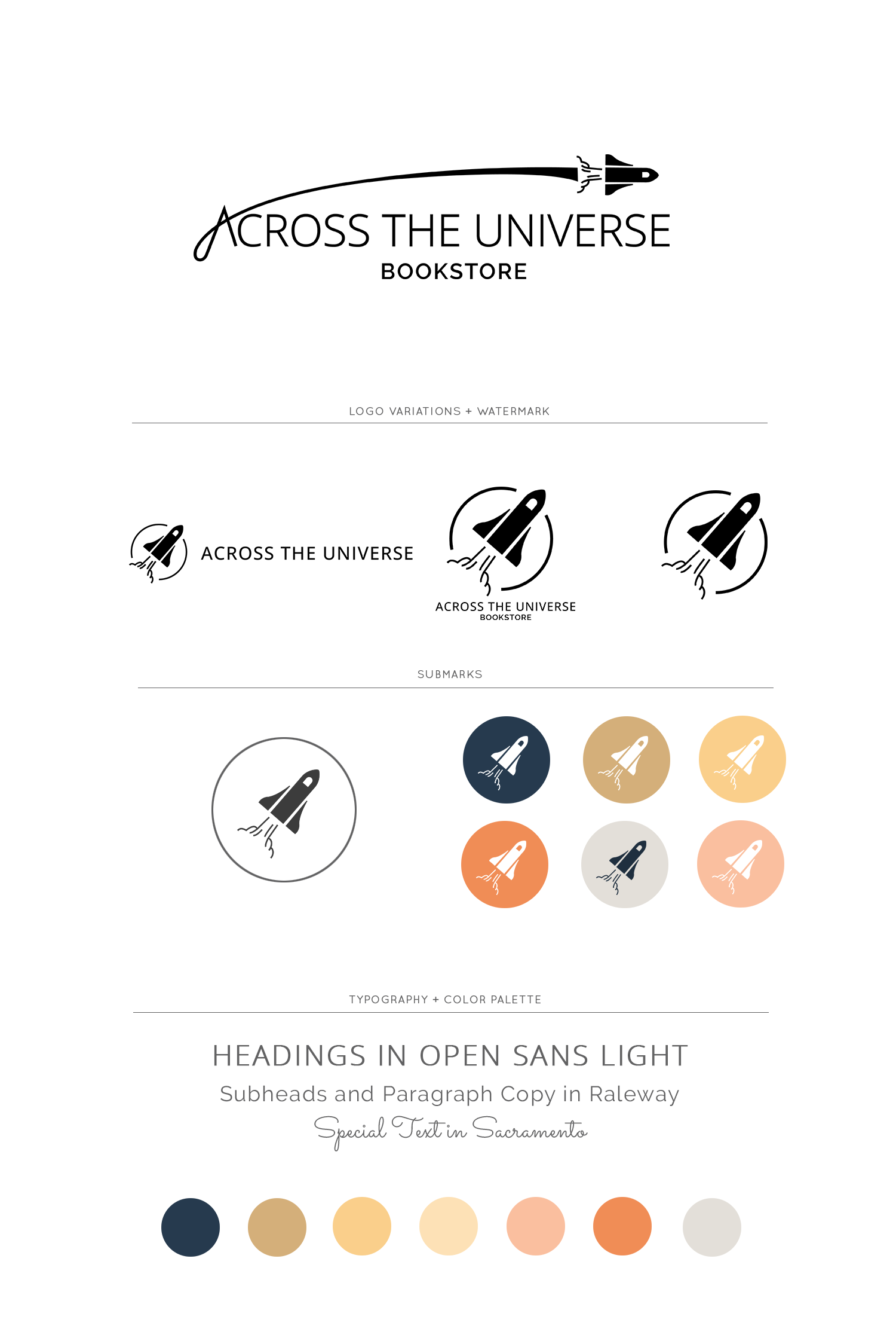 This is a email newsletter concept design for a fictional bookstore's website. The Across The Universe color palette is a blend of soft warm neutrals with pops of bright colors. The brand elements are centered around rocket ships and outer space, emphasizing the concept of books transporting us to different worlds. Between the bursts of color and the space-themed icons, the identity gives off a whimsical and inviting vibe.